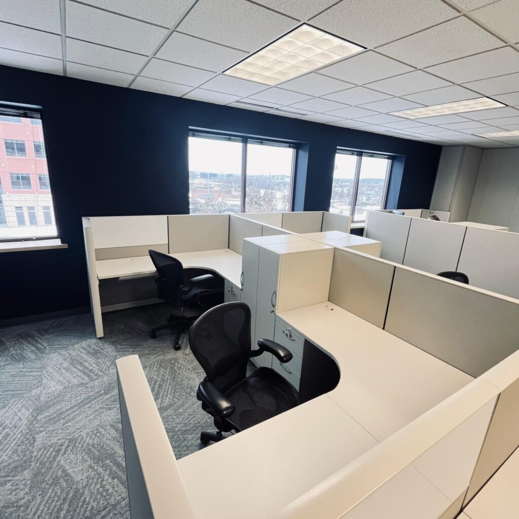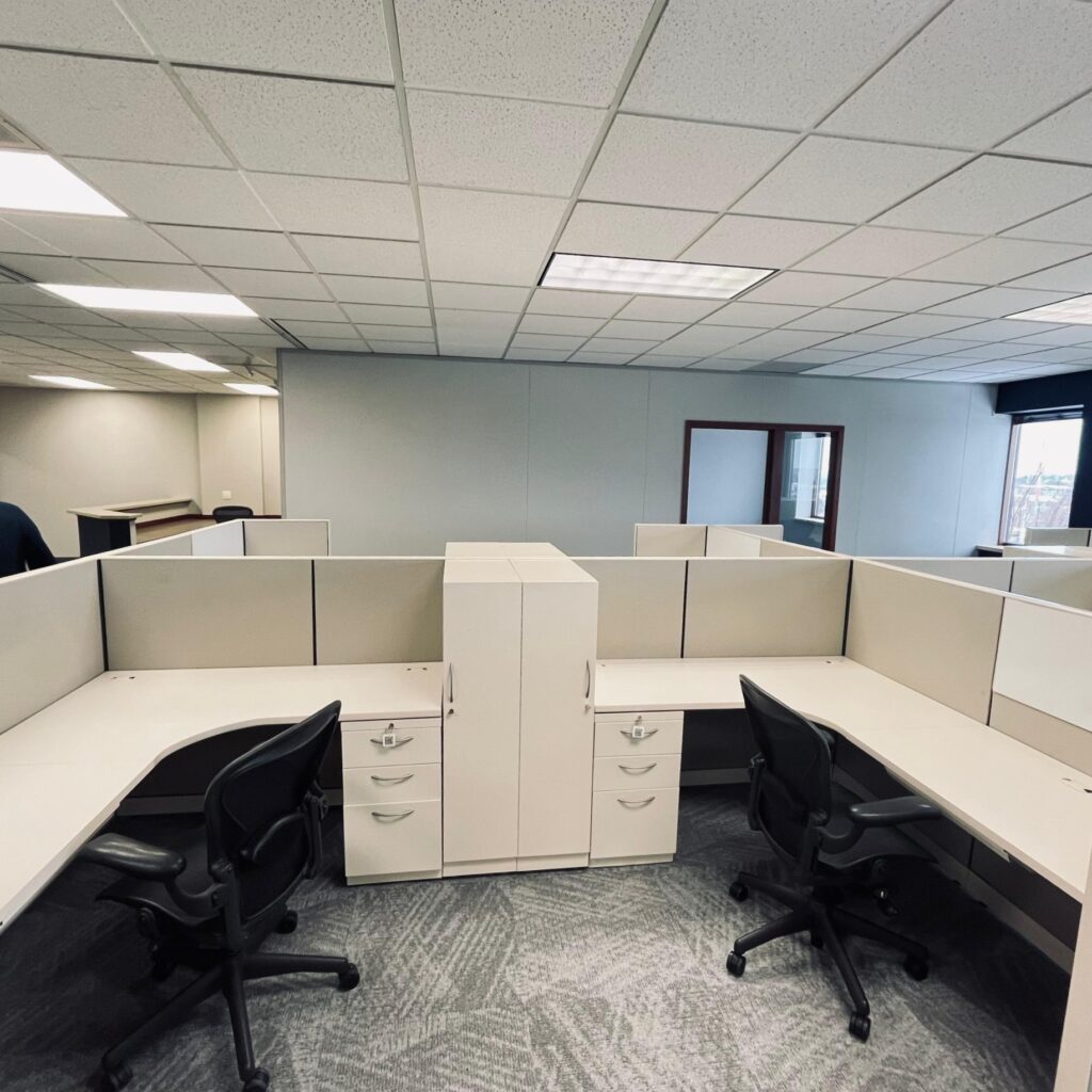 Six private offices were creatively constructed using repurposed surfaces, combined with stock legs and pedestal files from OFR’s used furniture inventory. This approach delivered fully functional private spaces while supporting the client’s sustainability goals and keeping the project on budget.