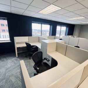 The Herman Miller Aeron Chair line was utilized in this project – adding pre-owned high performance commercial seating to the office space. The Aeron is all mesh, breathable, ergonomic, and has top of the line adjustment features. Buying used Aerons offers high quality at lower pricing, which makes it a perfect option for offices of all sizes. Interested in the Aeron? Shop it now!