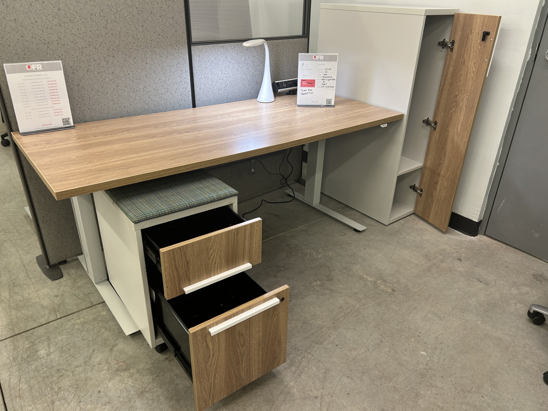 With quick and easy adjustable height functions, you can sit or stand while working at this standing desk. This recycled sit to stand desk looks great in any office with its light wood and white legs.